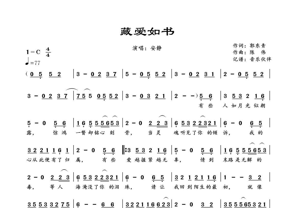 《藏爱如书》是安静演唱的一首歌曲,拍号为4/4拍,歌曲速度为每分钟77拍,这份简谱共有一张高清图谱,图谱由 @音乐伙伴 编配上传。