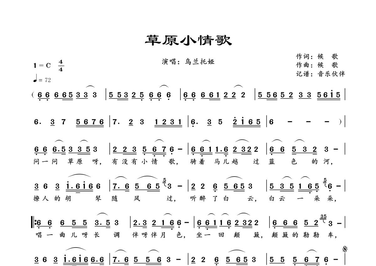 《草原小情歌》是乌兰托娅演唱的一首歌曲,拍号为4/4拍,歌曲速度为每分钟72拍,这份简谱共有一张高清图谱,图谱由 @音乐伙伴 编配上传。