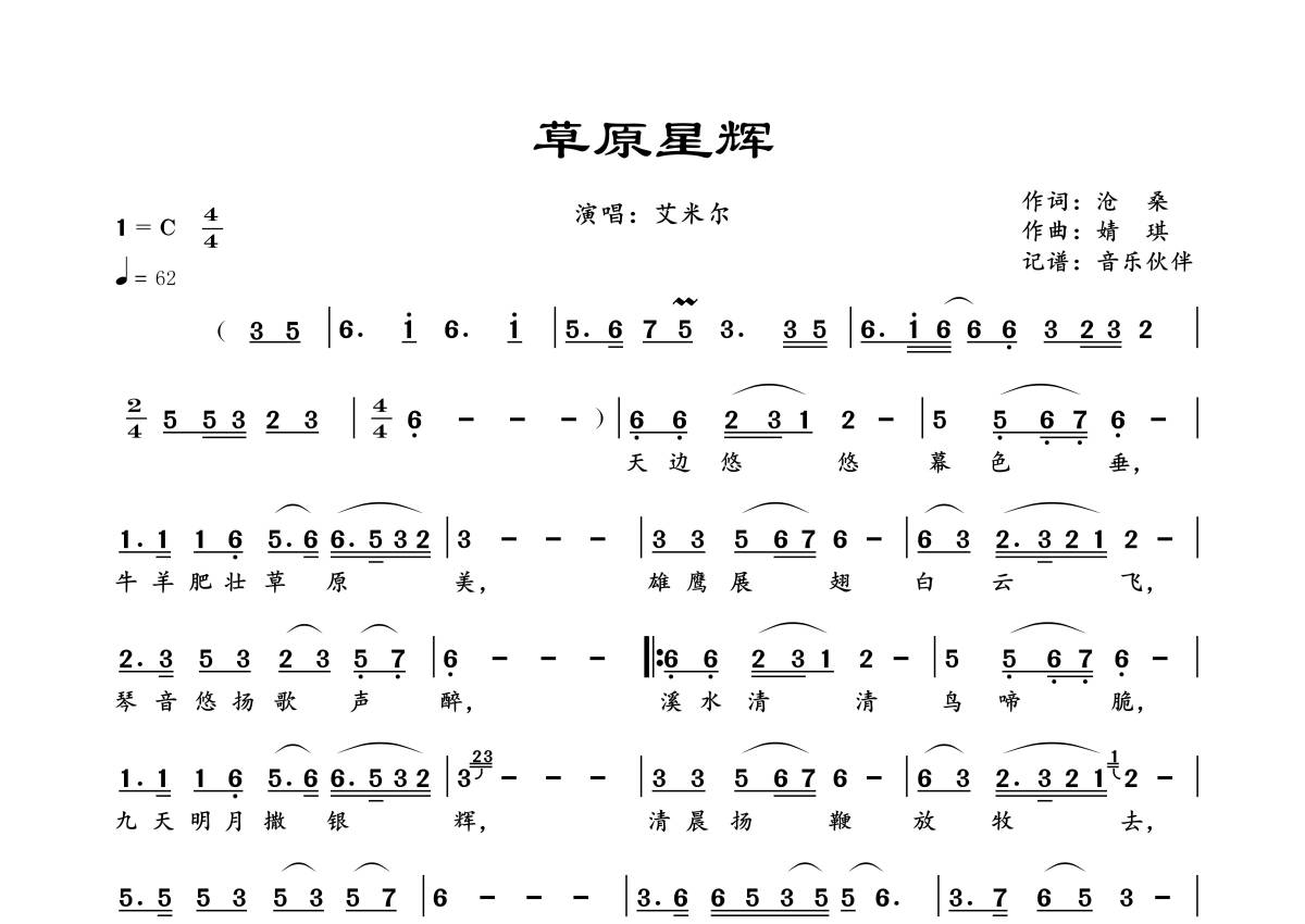 《草原星辉》是艾米尔演唱的一首歌曲,拍号为4/4拍,歌曲速度为每分钟62拍,这份简谱共有一张高清图谱,图谱由 @音乐伙伴 编配上传。