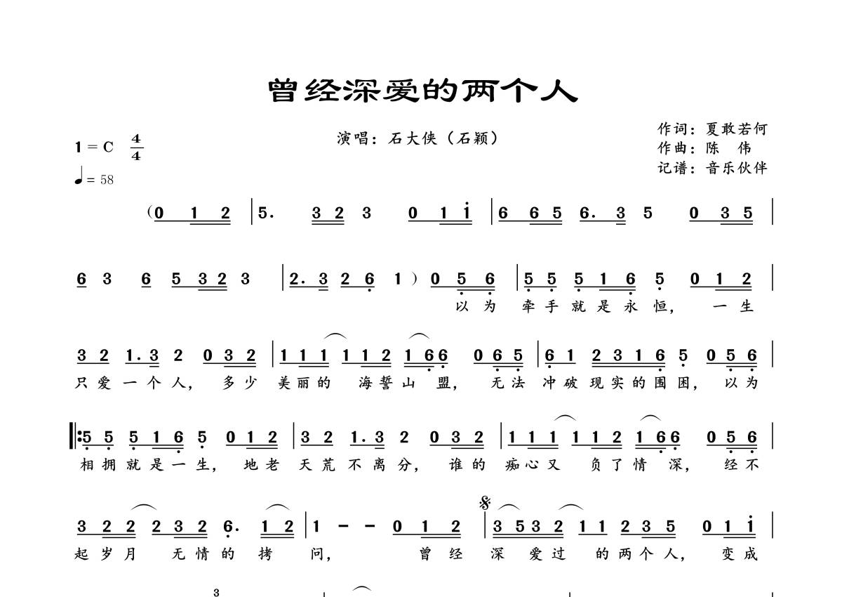 《曾经深爱的两个人》是石大侠演唱的一首歌曲,拍号为4/4拍,歌曲速度为每分钟58拍,这份简谱共有一张高清图谱,图谱由 @音乐伙伴 编配上传。