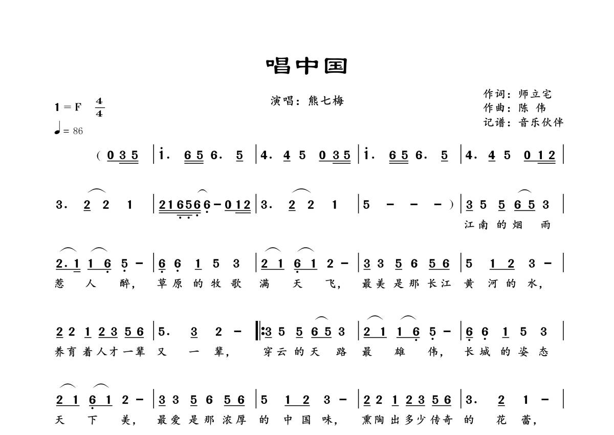《唱中国》是熊七梅演唱的一首歌曲,拍号为4/4拍,歌曲速度为每分钟86拍,这份简谱共有一张高清图谱,图谱由 @音乐伙伴 编配上传。