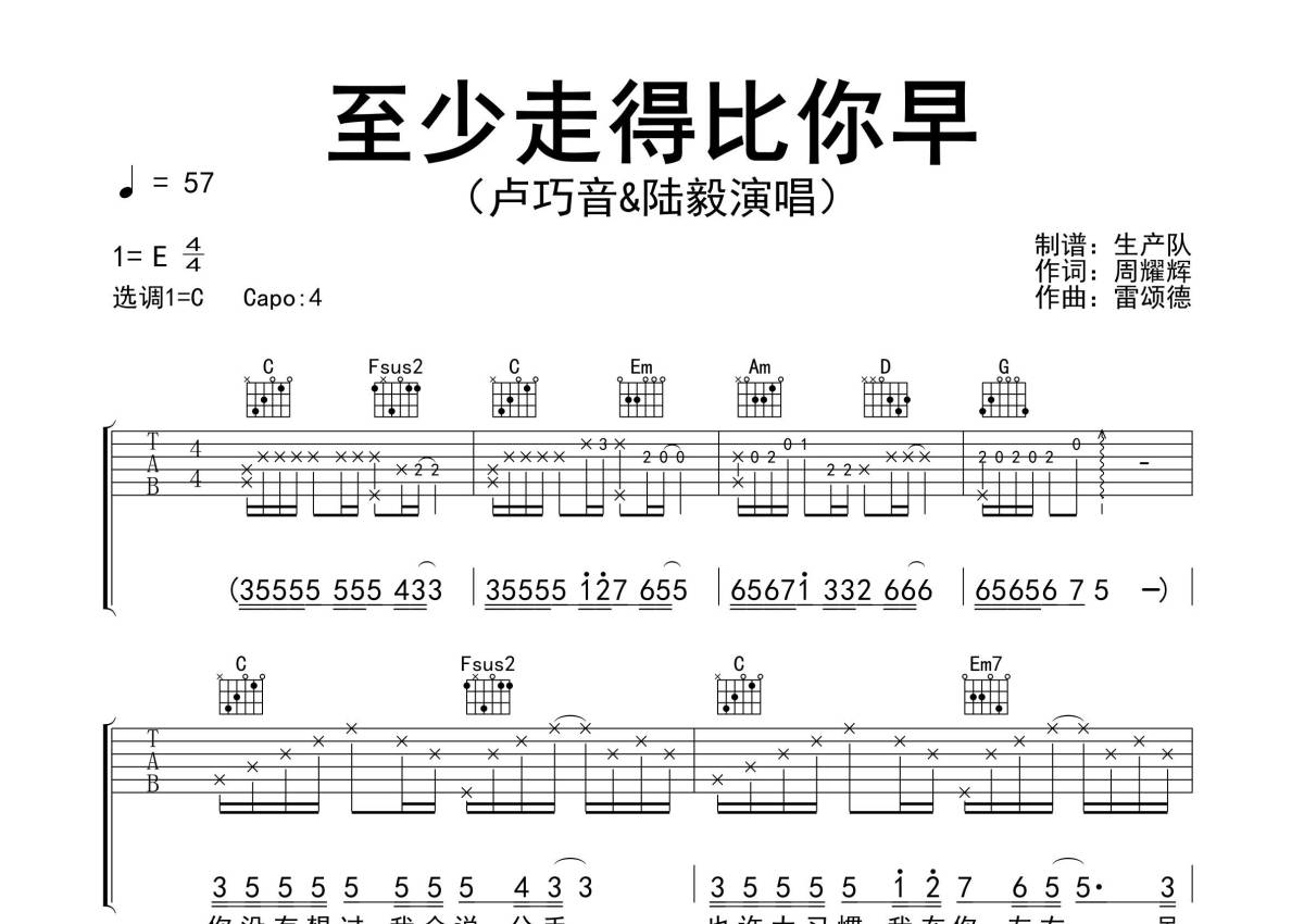 《至少走得比你早》是陆毅&卢巧音演唱的一首歌曲,精编民谣版,拍号为4/4拍,歌曲速度为每分钟57拍,歌曲原调为E调,但由于原调指法比较难,为了方便弹奏,本吉他谱采用的是C调指法编配,变调夹4品弹奏即为原调,当然也可以根据自己的音域改变变调夹位置,或者通过改变和弦调性,以方便自己弹奏,这份吉他谱共有三张高清图谱,图谱由 @生产队 编配上传,图谱使用六线谱编配,包含吉他和弦指法、简谱以及歌词部分,使用这份至少走得比你早吉他谱,可以让你更加方便地掌握这首歌曲的弹唱技巧,快来尝试吧。《至少走得比你早》是由雷颂德作曲,周耀辉作词,卢巧音和陆毅合唱的一首经典歌曲。本吉他谱根据原版C调指法编配,完整的前奏、间奏和SOLO编配,精编民谣版,值得推荐的作品。