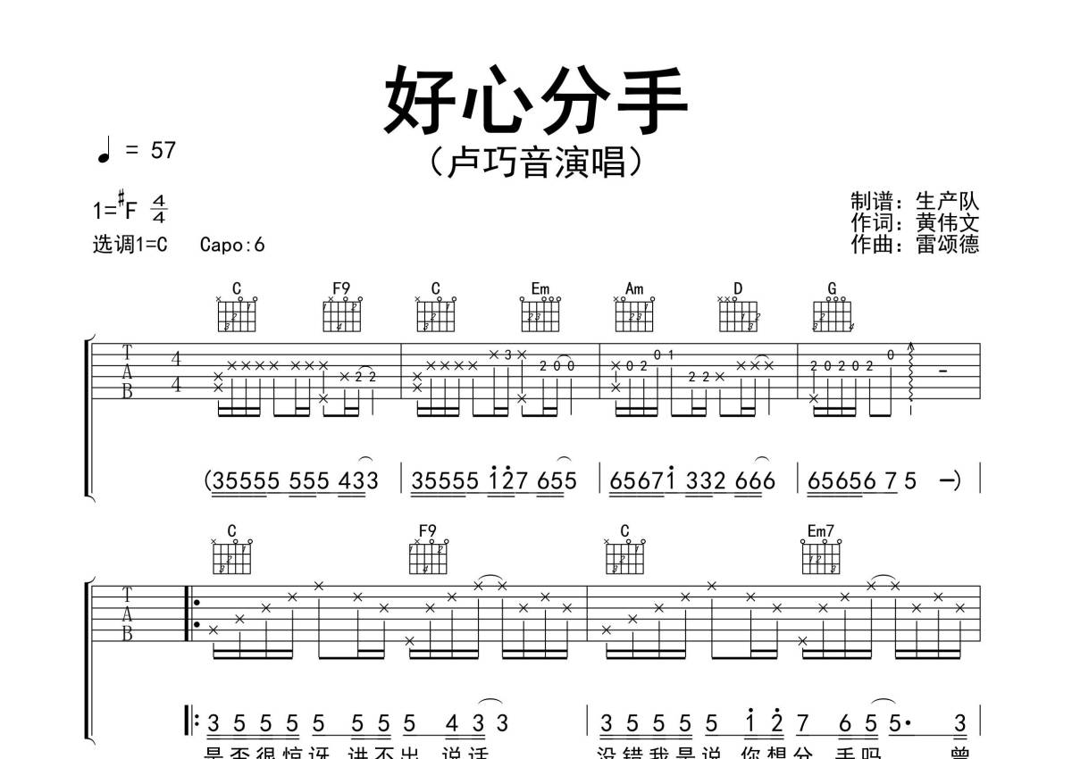 《好心分手》是卢巧音演唱的一首歌曲,精编民谣版,歌曲速度为每分钟57拍,歌曲原调为Gb调,但由于原调指法比较难,为了方便弹奏,本吉他谱采用的是C调指法编配,变调夹6品弹奏即为原调,当然也可以根据自己的音域改变变调夹位置,或者通过改变和弦调性,以方便自己弹奏,这份吉他谱共有三张高清图谱,图谱由 @生产队 编配上传,图谱使用六线谱编配,包含吉他和弦指法、简谱以及歌词部分,使用这份好心分手吉他谱,可以让你更加方便地掌握这首歌曲的弹唱技巧,快来尝试吧。《好心分手》是由黄伟文作词,雷颂德作曲,卢巧音演唱的一首经典歌曲。本吉他谱根据原版C调指法编配,完整的前奏、间奏和SOLO编配,精编民谣版,值得推荐的作品。