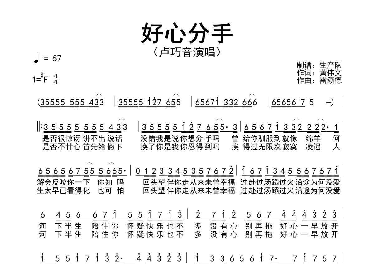 《好心分手》是卢巧音演唱的一首歌曲,原版简谱,拍号为4/4拍,歌曲速度为每分钟57拍,这份简谱共有一张高清图谱,图谱由 @生产队 编配上传卢巧音演唱的经典歌曲《好心分手》简谱。