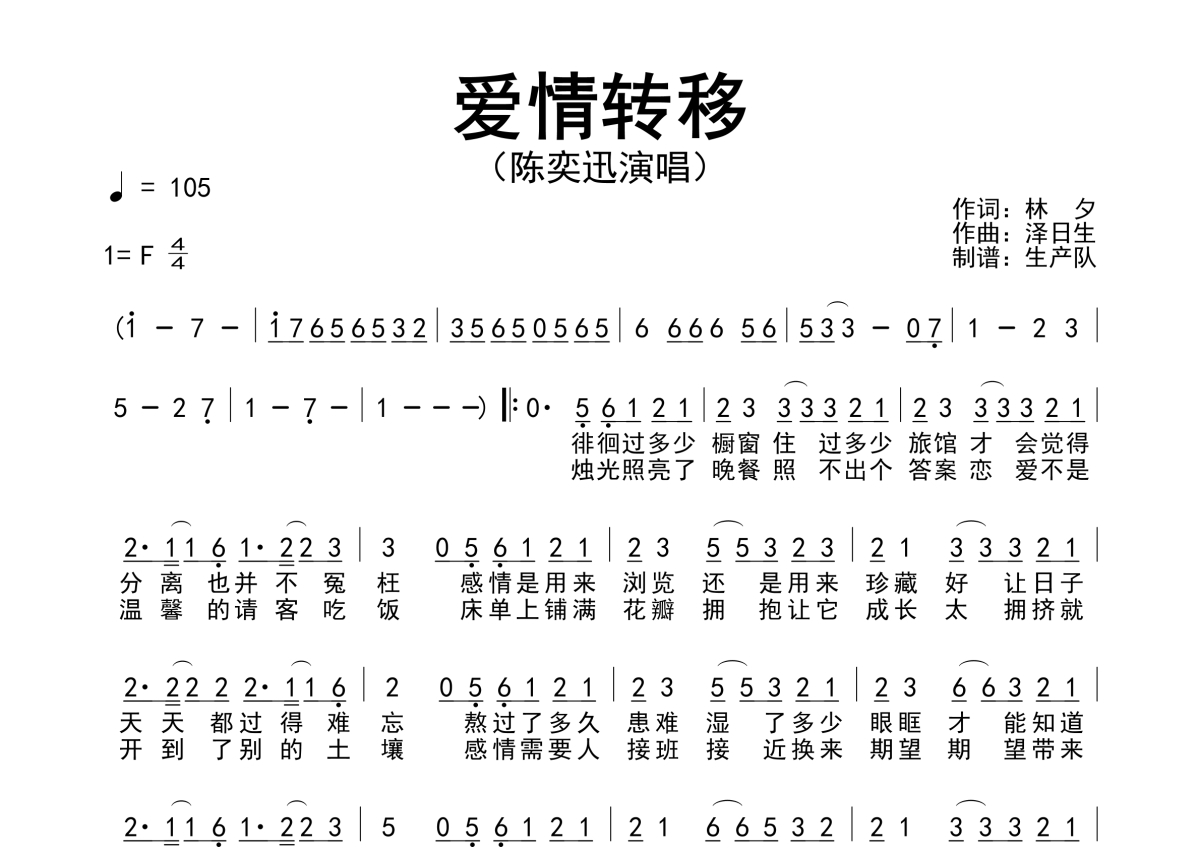 《爱情转移》是陈奕迅演唱的一首歌曲,原版简谱,拍号为4/4拍,歌曲速度为每分钟105拍,这份简谱共有一张高清图谱,图谱由 @生产队 编配上传陈奕迅演唱的经典歌曲《爱情转移》原版简谱。
