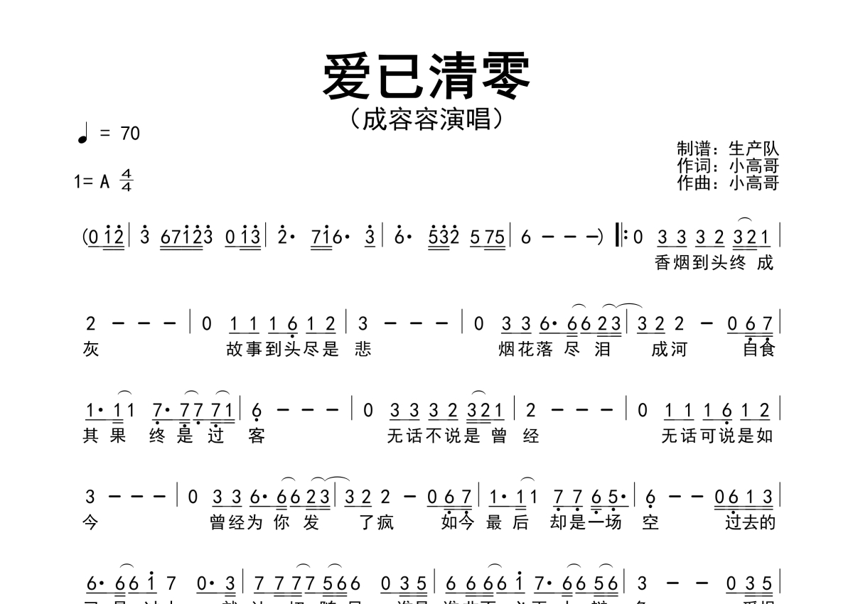 《爱已清零》是成容容演唱的一首歌曲,原版简谱,拍号为4/4拍,歌曲速度为每分钟70拍,这份简谱共有一张高清图谱,图谱由 @生产队 编配上传成容容演唱的经典歌曲《爱已清零》原版简谱。