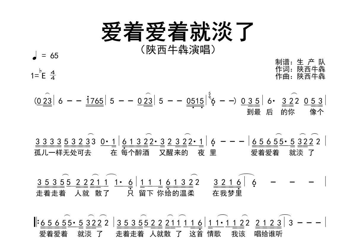 《爱着爱着就淡了》是陕西牛犇演唱的一首歌曲,原版简谱,拍号为4/4拍,歌曲速度为每分钟65拍,这份简谱共有一张高清图谱,图谱由 @生产队 编配上传陕西牛犇演唱的民谣歌曲《爱着爱着就淡了》原版简谱。