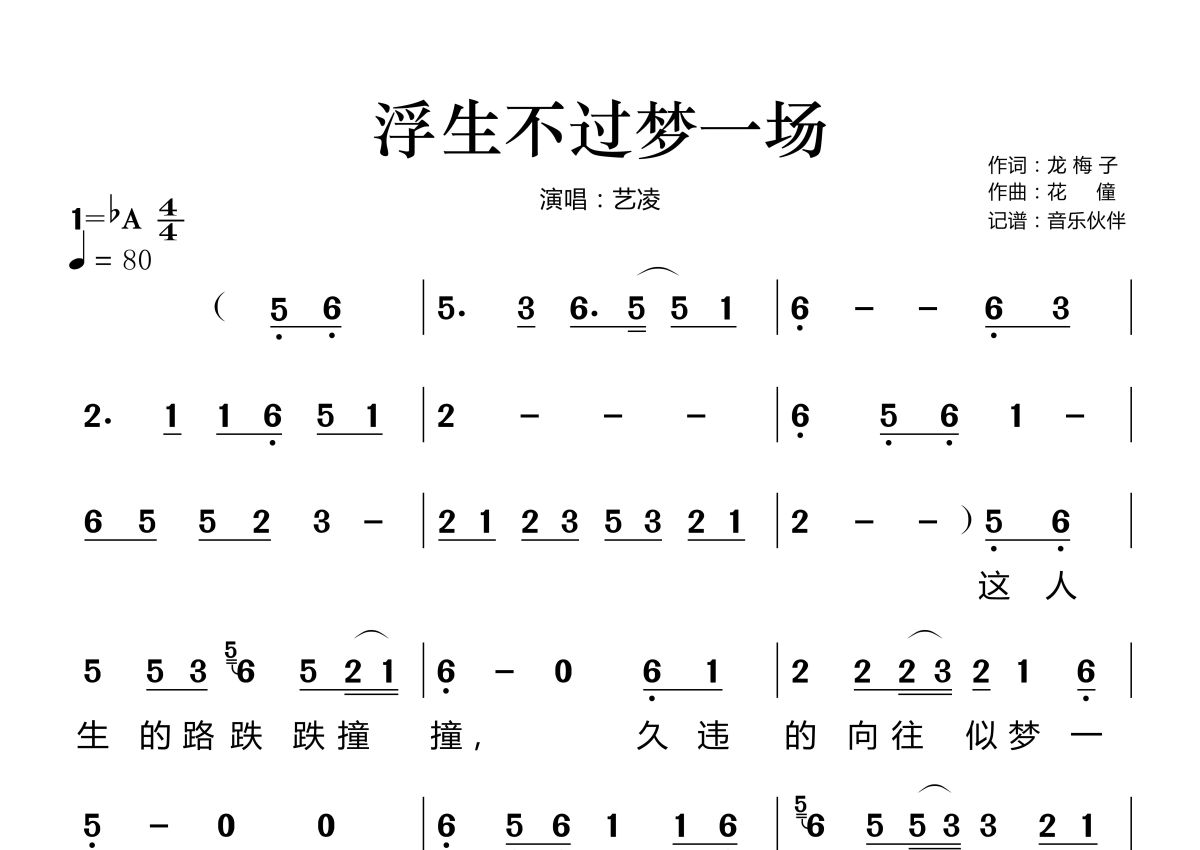 《浮生不过梦一场》是艺凌演唱的一首歌曲,这份简谱共有两张高清图谱,图谱由 @音乐伙伴 编配上传。