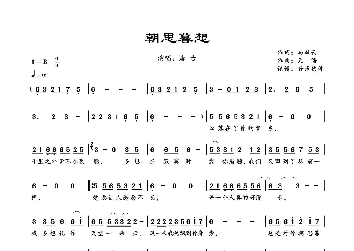 《朝思暮想》是唐古演唱的一首歌曲,拍号为4/4拍,歌曲速度为每分钟92拍,这份简谱共有一张高清图谱,图谱由 @音乐伙伴 编配上传。