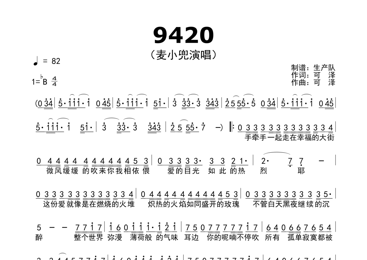 《9420》是麦小兜演唱的一首歌曲,原版简谱,拍号为4/4拍,歌曲速度为每分钟82拍,这份简谱共有一张高清图谱,图谱由 @生产队 编配上传麦小兜演唱的歌曲《9420》原版简谱。