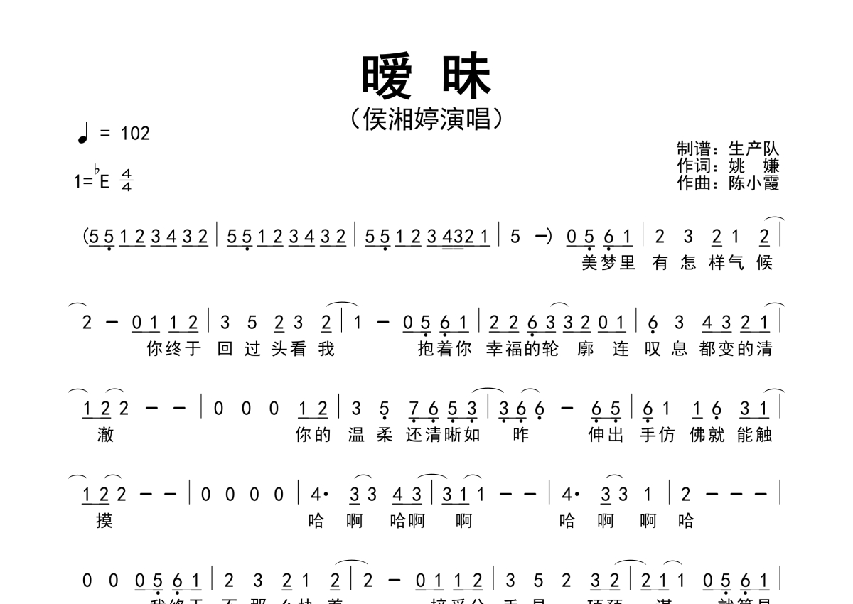《暧昧》是侯湘婷演唱的一首歌曲,原版简谱,拍号为4/4拍,歌曲速度为每分钟102拍,这份简谱共有一张高清图谱,图谱由 @生产队 编配上传侯湘婷演唱的经典歌曲《暧昧》原版简谱。