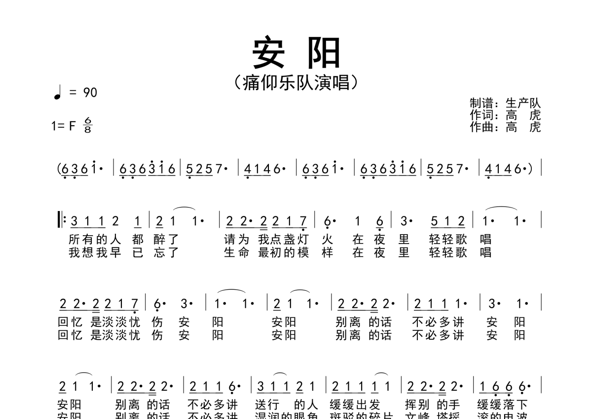 《安阳》是痛仰乐队演唱的一首歌曲,原版简谱,拍号为6/8拍,歌曲速度为每分钟90拍,这份简谱共有一张高清图谱,图谱由 @生产队 编配上传痛仰乐队演唱的经典歌曲《安阳》原版简谱。