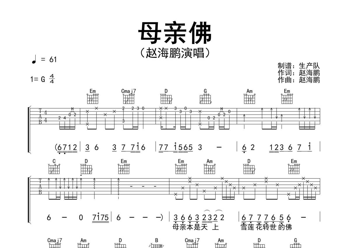 《母亲佛》是赵海鹏演唱的一首歌曲,精编完美版,拍号为4/4拍,歌曲速度为每分钟61拍,歌曲原调为G调,本吉他谱采用的是G调指法编配,演奏时不需要使用变调夹即为原调,这份吉他谱共有三张高清图谱,图谱由 @生产队 编配上传,图谱使用六线谱编配,包含吉他和弦指法、简谱以及歌词部分,使用这份母亲佛吉他谱,可以让你更加方便地掌握这首歌曲的弹唱技巧,快来尝试吧。《母亲佛》是歌手赵海鹏作词、作曲并演唱的一首原创歌曲。本吉他谱根据原版G调指法编配,精准的前奏、间奏、尾奏和SOLO编配,精编一音不差版,献给最爱的母亲!。
