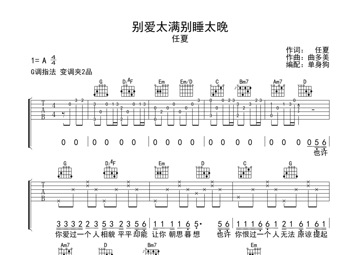 任夏《别爱太满别睡太晚》吉他谱 - G调弹唱六线谱