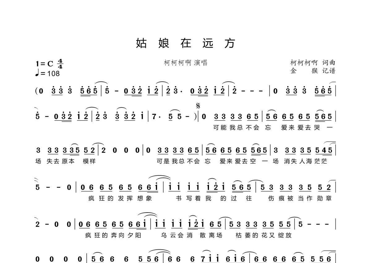 《姑娘在远方》是柯柯柯啊演唱的一首歌曲,拍号为4/4拍,歌曲速度为每分钟108拍,这份简谱共有一张高清图谱,图谱由 @金猴奋起千钧棒 编配上传。