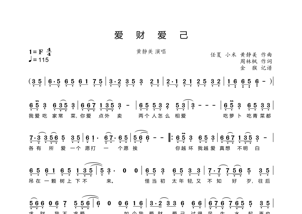 《爱财爱己》是黄静美演唱的一首歌曲,拍号为4/4拍,歌曲速度为每分钟115拍,这份简谱共有两张高清图谱,图谱由 @金猴奋起千钧棒 编配上传。