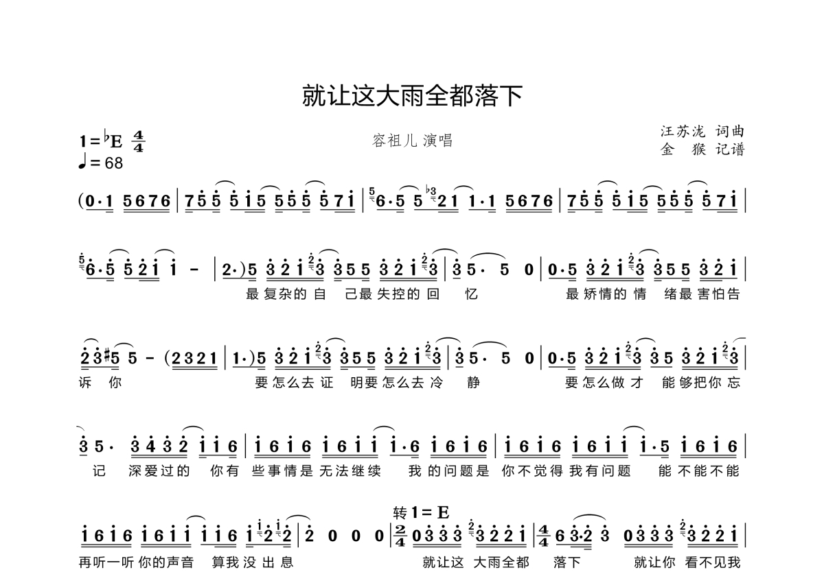 《就让这大雨全都落下》是容祖儿演唱的一首歌曲,拍号为4/4拍,歌曲速度为每分钟68拍,这份简谱共有两张高清图谱,图谱由 @金猴奋起千钧棒 编配上传。