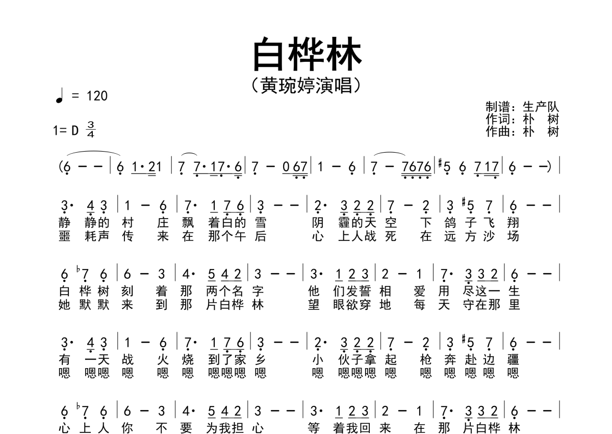 《白桦林》是黄琬婷演唱的一首歌曲,原版简谱,拍号为3/4拍,歌曲速度为每分钟120拍,这份简谱共有一张高清图谱,图谱由 @生产队 编配上传黄琬婷演唱的经典歌曲《白桦林》原版简谱。
