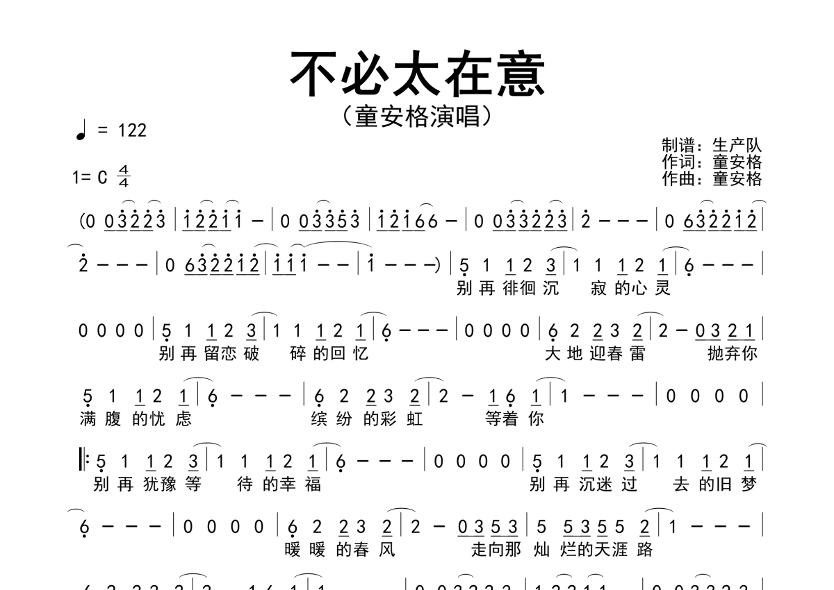 《不必太在意》是童安格演唱的一首歌曲,拍号为4/4拍,歌曲速度为每分钟122拍,这份简谱共有一张高清图谱,图谱由 @生产队 编配上传童安格演唱的歌曲《不必太在意》简谱。