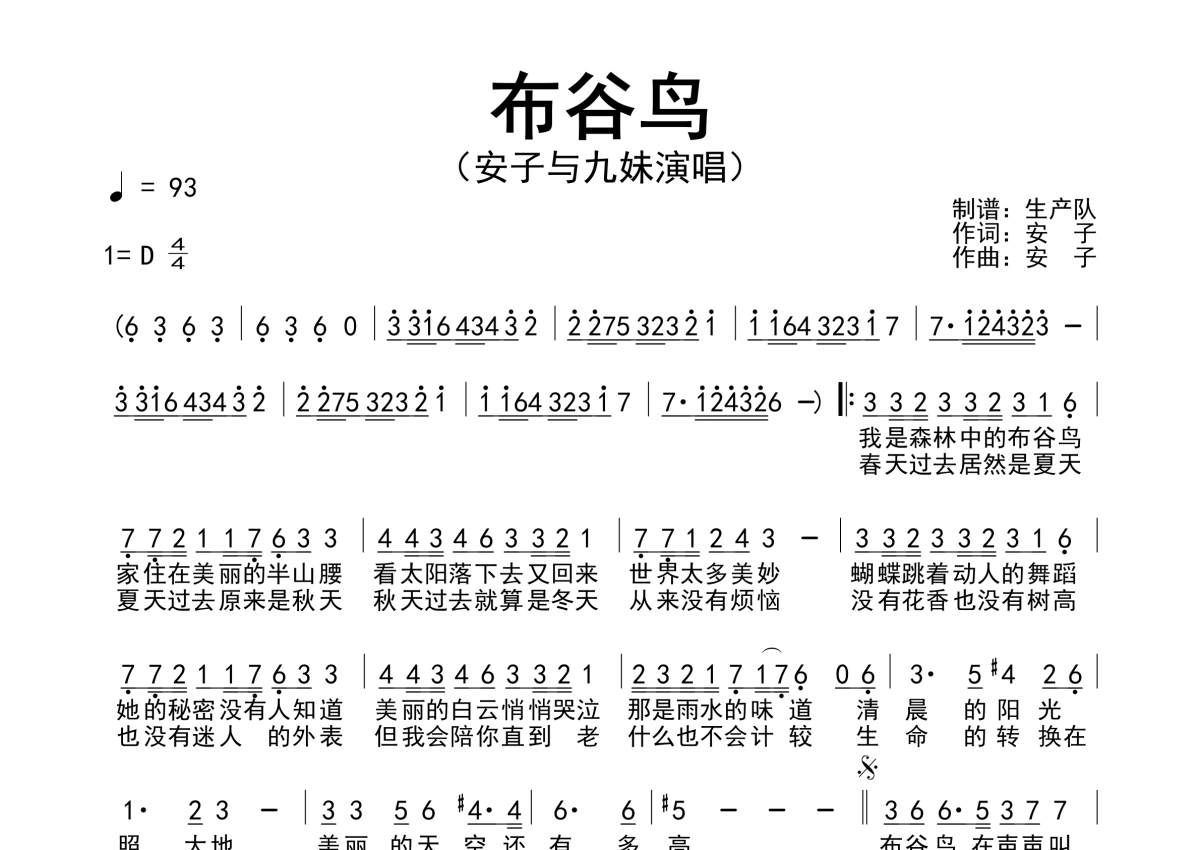 《布谷鸟》是安子与九妹演唱的一首歌曲,简谱,拍号为4/4拍,歌曲速度为每分钟93拍,这份简谱共有一张高清图谱,图谱由 @生产队 编配上传安子与九妹演唱的歌曲《布谷鸟》简谱。
