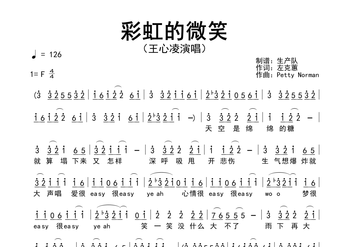 《彩虹的微笑》是王心凌演唱的一首歌曲,简谱,拍号为4/4拍,歌曲速度为每分钟126拍,这份简谱共有一张高清图谱,图谱由 @生产队 编配上传王心凌演唱的歌曲《彩虹的微笑》简谱。