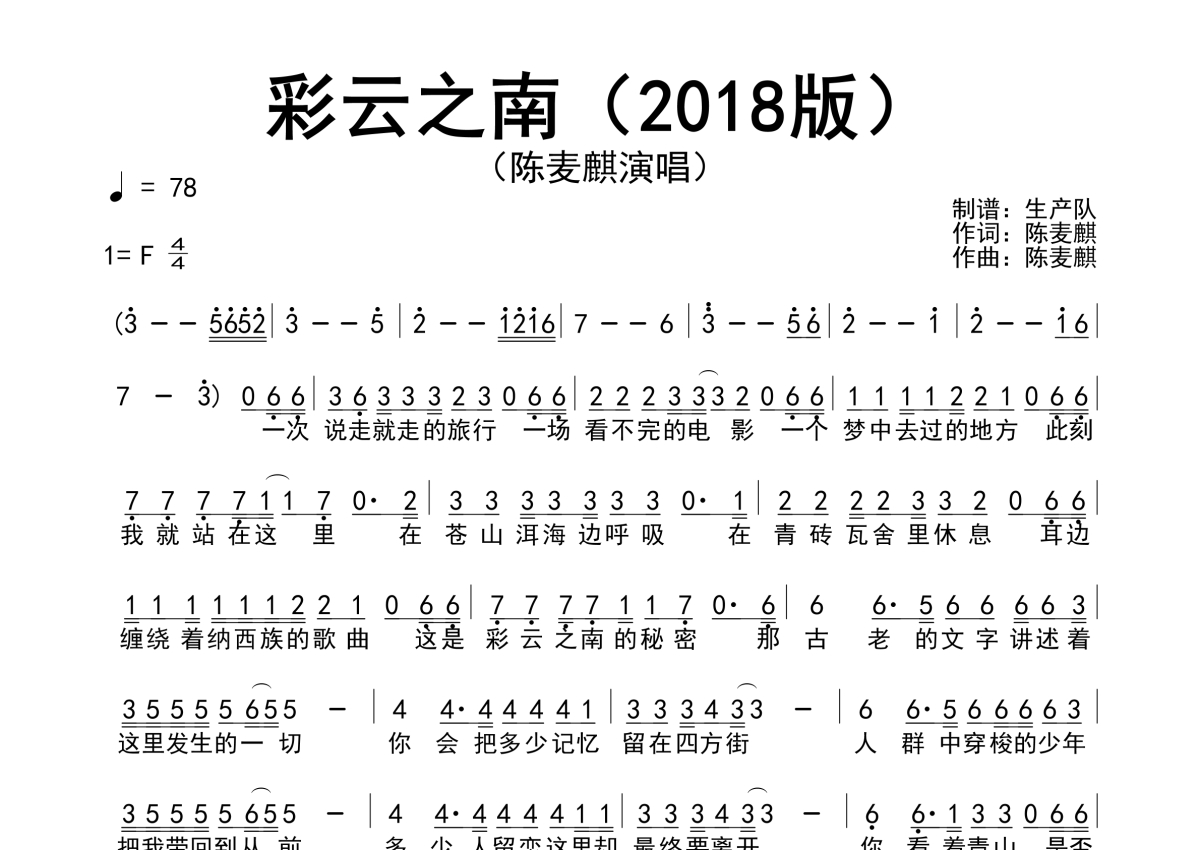 《彩云之南》是陈麦琪演唱的一首歌曲,简谱,拍号为4/4拍,歌曲速度为每分钟78拍,这份简谱共有一张高清图谱,图谱由 @生产队 编配上传陈麦琪演唱的歌曲《彩云之南》(2018版)简谱。