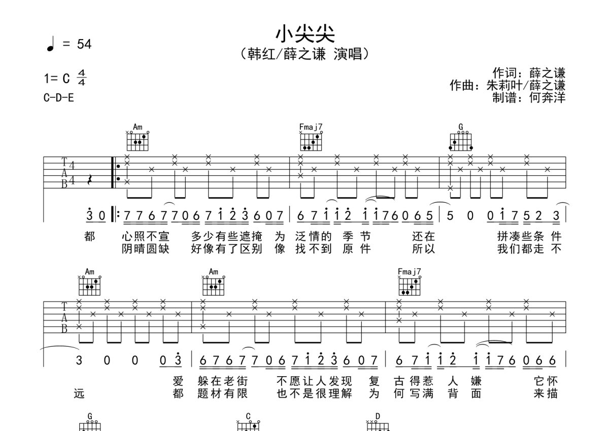 薛之谦/韩红《小尖尖》吉他谱 - C调弹唱六线谱