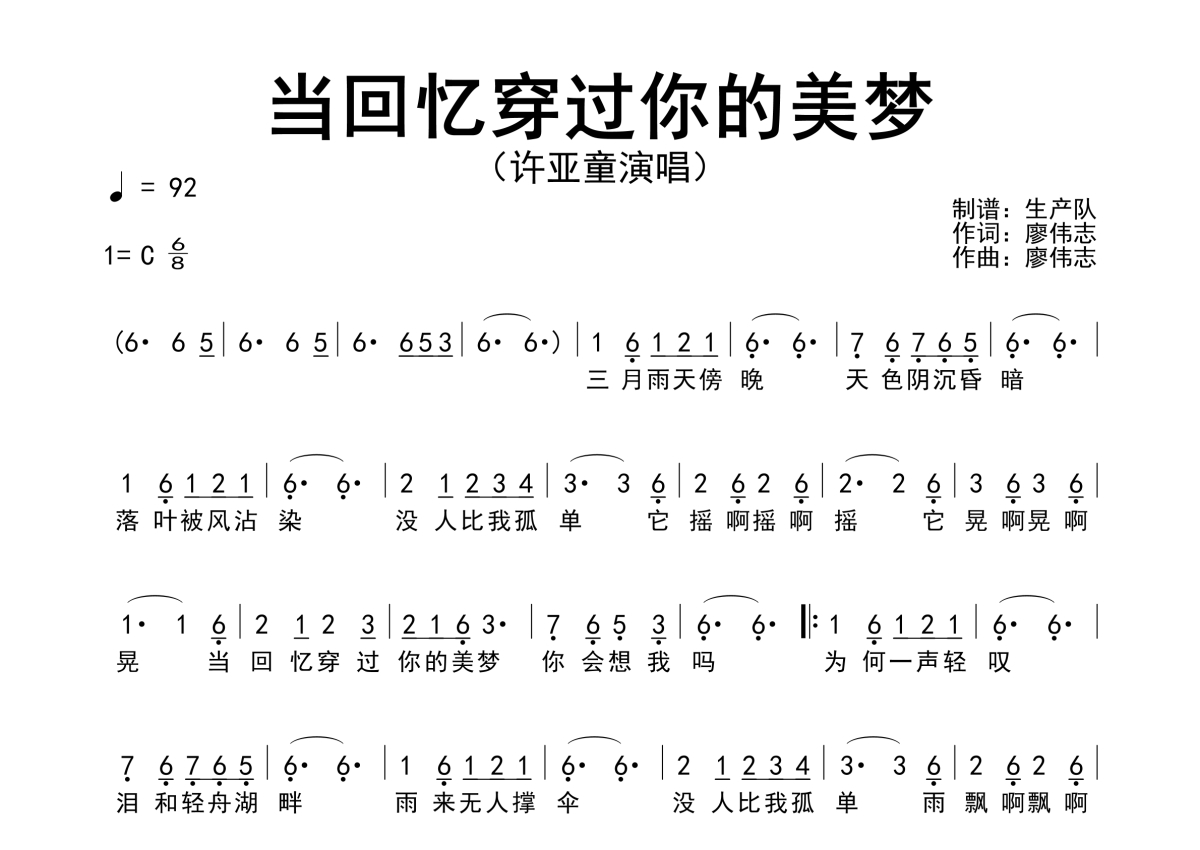 《当回忆穿过你的美梦》是许亚童演唱的一首歌曲,简谱,拍号为6/8拍,歌曲速度为每分钟92拍,这份简谱共有一张高清图谱,图谱由 @生产队 编配上传许亚童演唱的歌曲《当回忆穿过你的美梦》简谱。