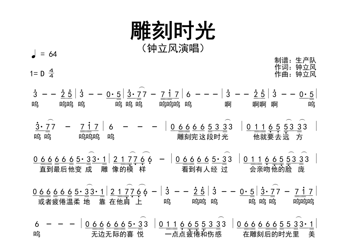 《雕刻时光》是钟立风演唱的一首歌曲,简谱,拍号为4/4拍,歌曲速度为每分钟64拍,这份简谱共有一张高清图谱,图谱由 @生产队 编配上传钟立风演唱的歌曲《雕刻时光》简谱。
