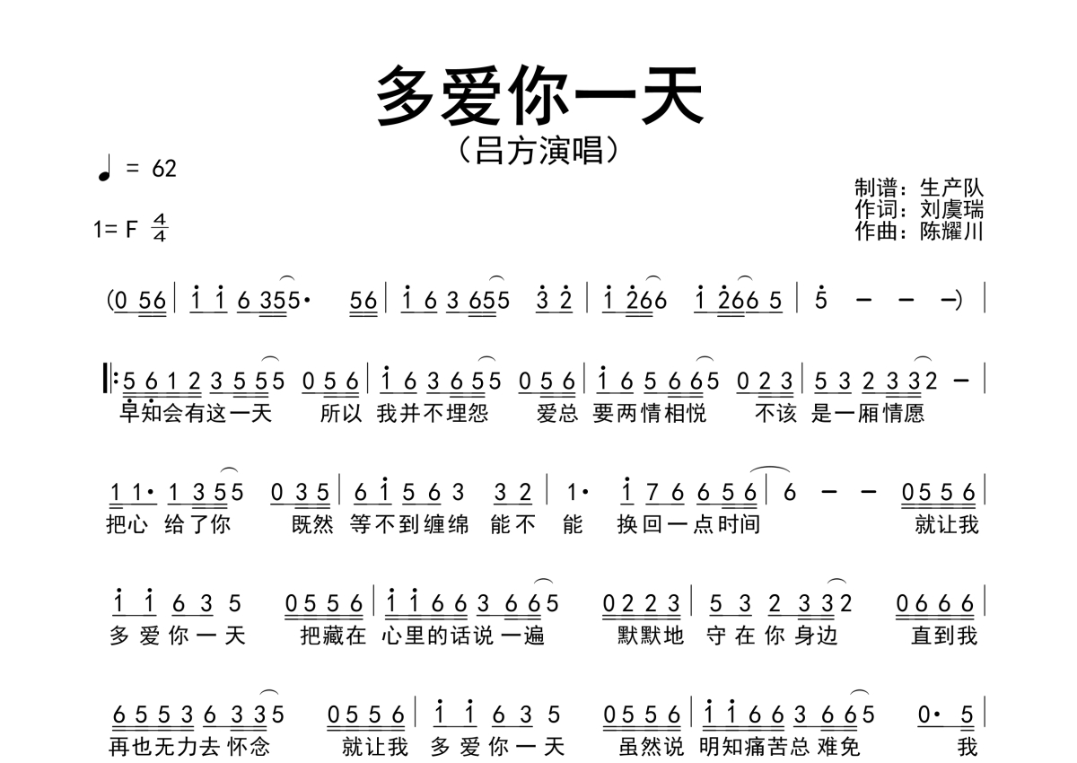《多爱你一天》是吕方演唱的一首歌曲,简谱,拍号为4/4拍,歌曲速度为每分钟62拍,这份简谱共有一张高清图谱,图谱由 @生产队 编配上传吕方演唱的歌曲《多爱你一天》简谱。