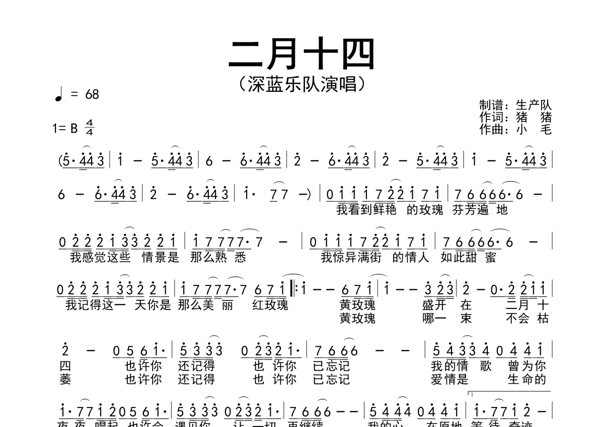 《二月十四》是深蓝乐队演唱的一首歌曲,拍号为4/4拍,歌曲速度为每分钟68拍,这份简谱共有一张高清图谱,图谱由 @生产队 编配上传深蓝乐队演唱的歌曲《二月十四》简谱。