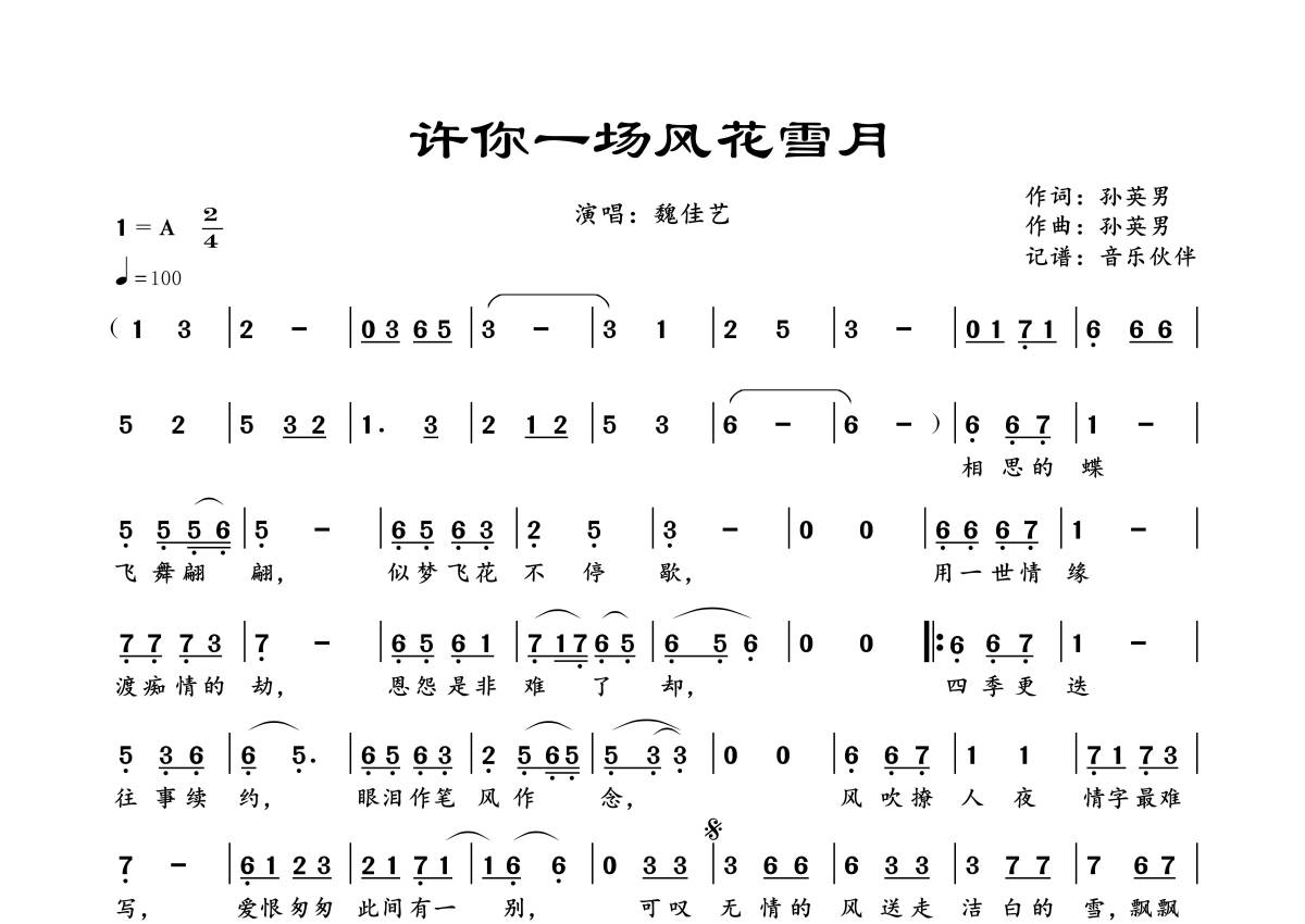《许你一场风花雪月》是魏佳艺演唱的一首歌曲,拍号为2/4拍,歌曲速度为每分钟100拍,这份简谱共有一张高清图谱,图谱由 @音乐伙伴 编配上传。