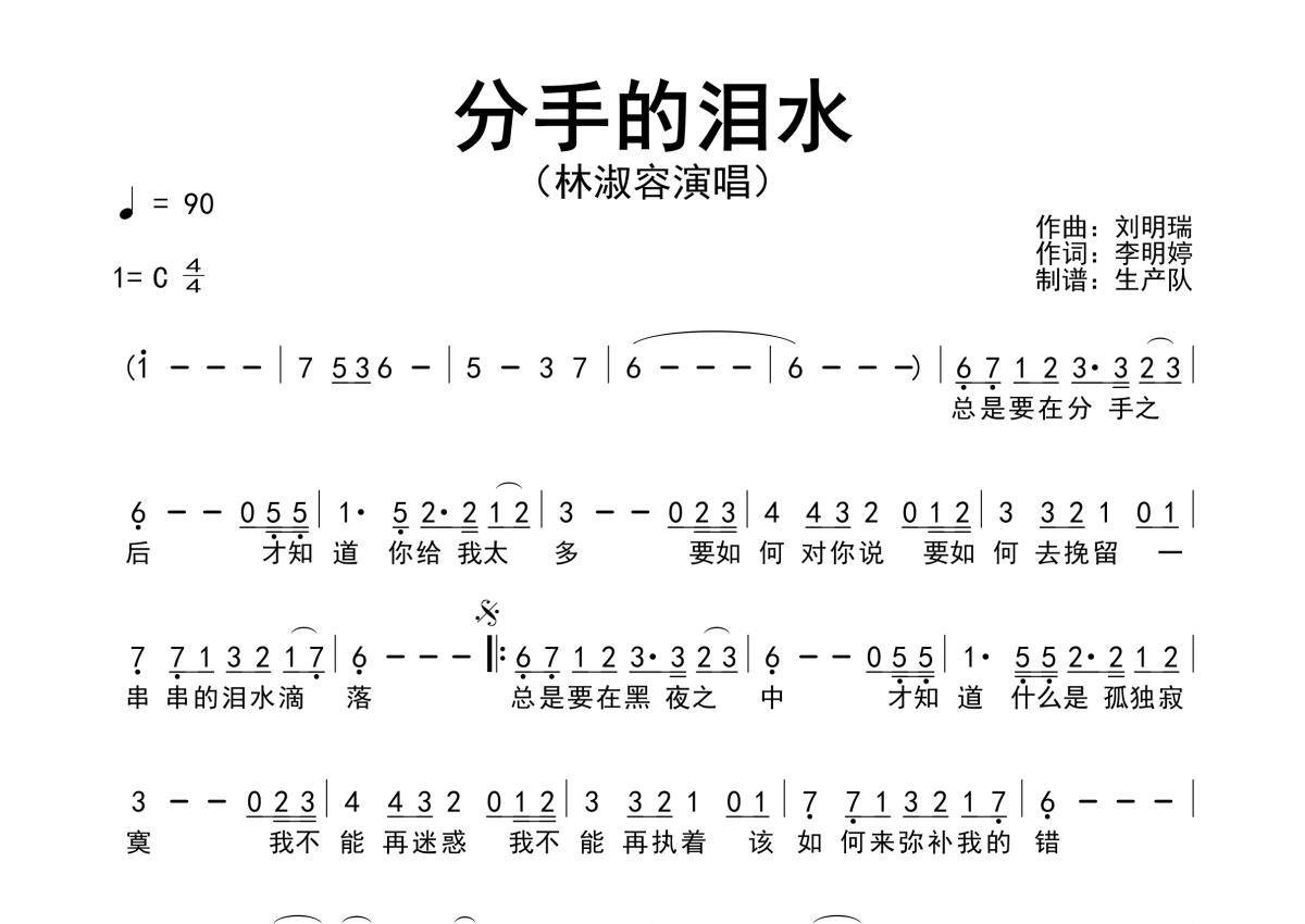 《分手的泪水》是林淑容演唱的一首歌曲,简谱,拍号为4/4拍,歌曲速度为每分钟90拍,这份简谱共有一张高清图谱,图谱由 @生产队 编配上传林淑容演唱的歌曲《分手的泪水》简谱。
