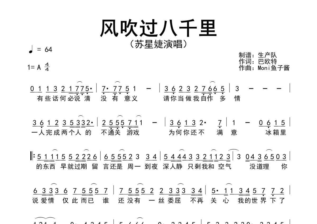 《风吹过八千里》是苏星婕演唱的一首歌曲,简谱,拍号为4/4拍,歌曲速度为每分钟64拍,这份简谱共有一张高清图谱,图谱由 @生产队 编配上传苏星婕演唱的歌曲《风吹过八千里》简谱。