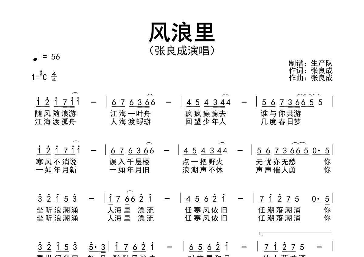 《风浪里》是张良成演唱的一首歌曲,简谱,拍号为4/4拍,歌曲速度为每分钟56拍,这份简谱共有一张高清图谱,图谱由 @生产队 编配上传张良成演唱的歌曲《风浪里》简谱。
