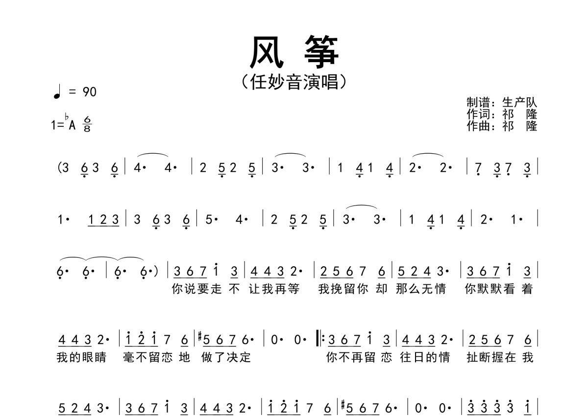 《风筝》是任妙音演唱的一首歌曲,简谱,拍号为6/8拍,歌曲速度为每分钟90拍,这份简谱共有一张高清图谱,图谱由 @生产队 编配上传任妙音演唱的歌曲《风筝》简谱。