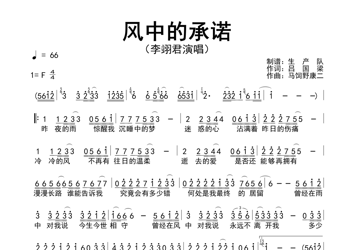 《风中的承诺》是李翊君演唱的一首歌曲,简谱,拍号为4/4拍,歌曲速度为每分钟66拍,这份简谱共有一张高清图谱,图谱由 @生产队 编配上传李翊君演唱的歌曲《风中的承诺》简谱。