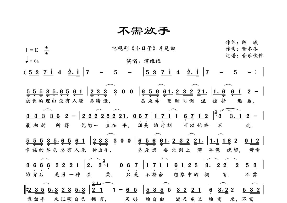 《不需放手》是谭维维演唱的一首歌曲,拍号为4/4拍,歌曲速度为每分钟64拍,这份简谱共有一张高清图谱,图谱由 @音乐伙伴 编配上传《小日子》电视剧片尾曲。