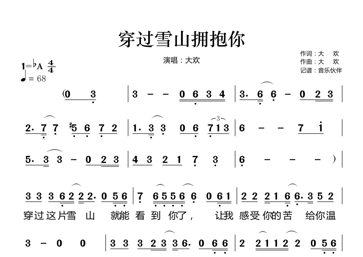 穿过雪山拥抱你简谱 - 大欢演唱