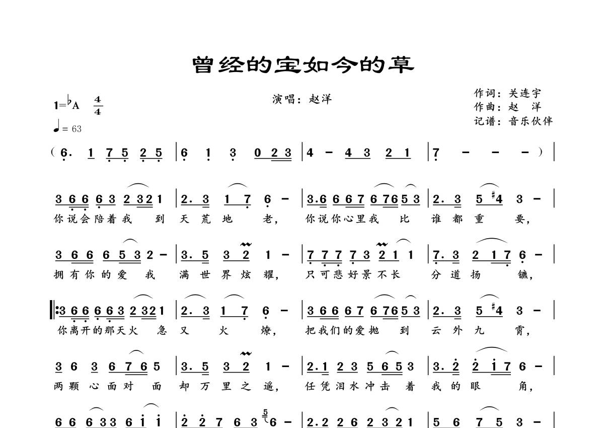 《曾经的宝如今的草》是赵洋演唱的一首歌曲,拍号为4/4拍,歌曲速度为每分钟63拍,这份简谱共有一张高清图谱,图谱由 @音乐伙伴 编配上传。