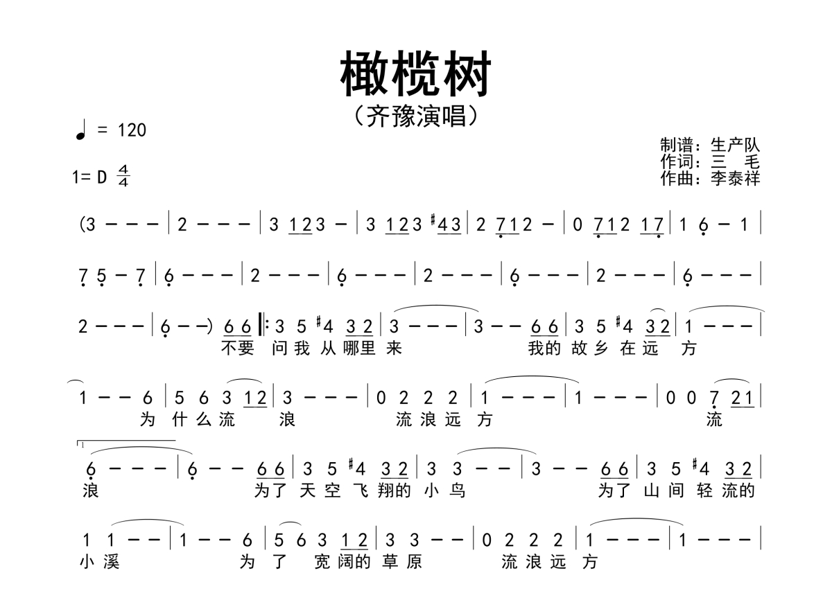 《橄榄树》是齐豫演唱的一首歌曲,简谱,拍号为4/4拍,歌曲速度为每分钟120拍,这份简谱共有一张高清图谱,图谱由 @生产队 编配上传齐豫演唱的歌曲《橄榄树》简谱。