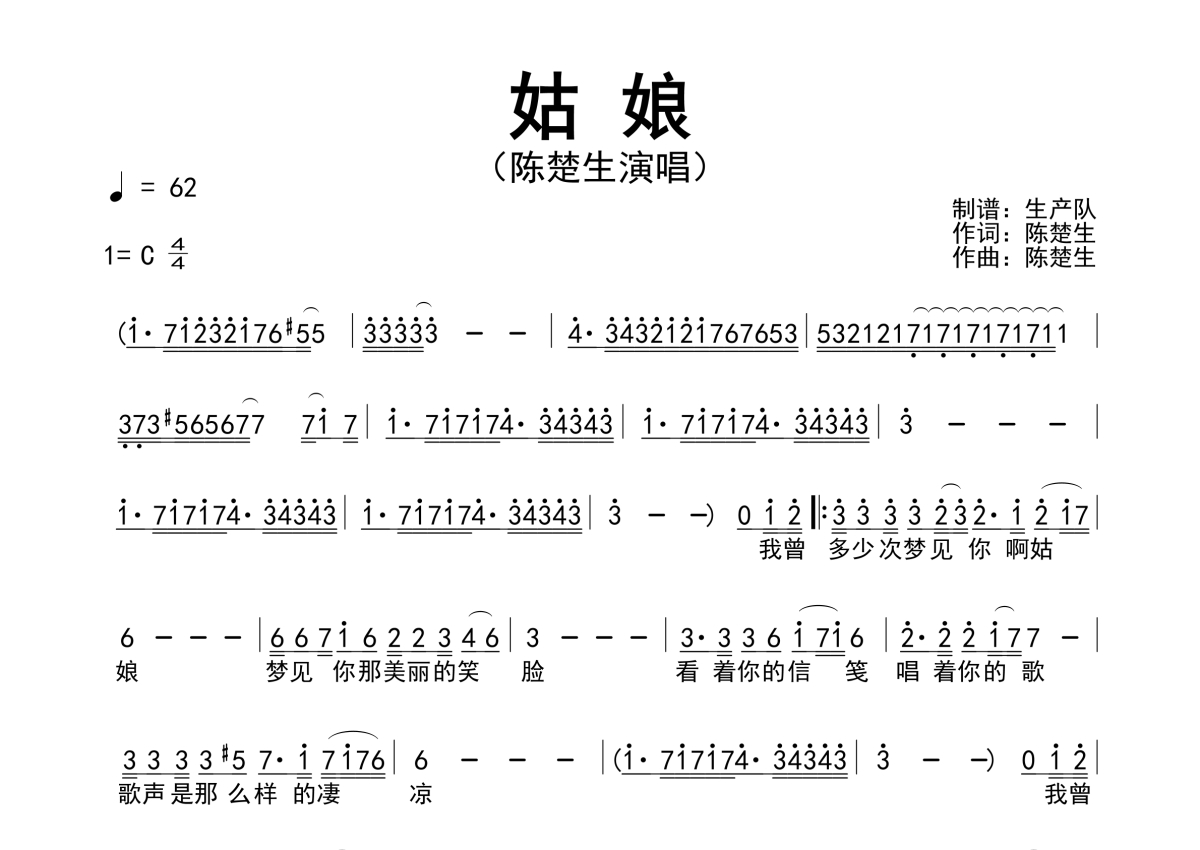 《姑娘》是陈楚生演唱的一首歌曲,简谱,拍号为4/4拍,歌曲速度为每分钟62拍,这份简谱共有一张高清图谱,图谱由 @生产队 编配上传陈楚生演唱的歌曲《姑娘》简谱。