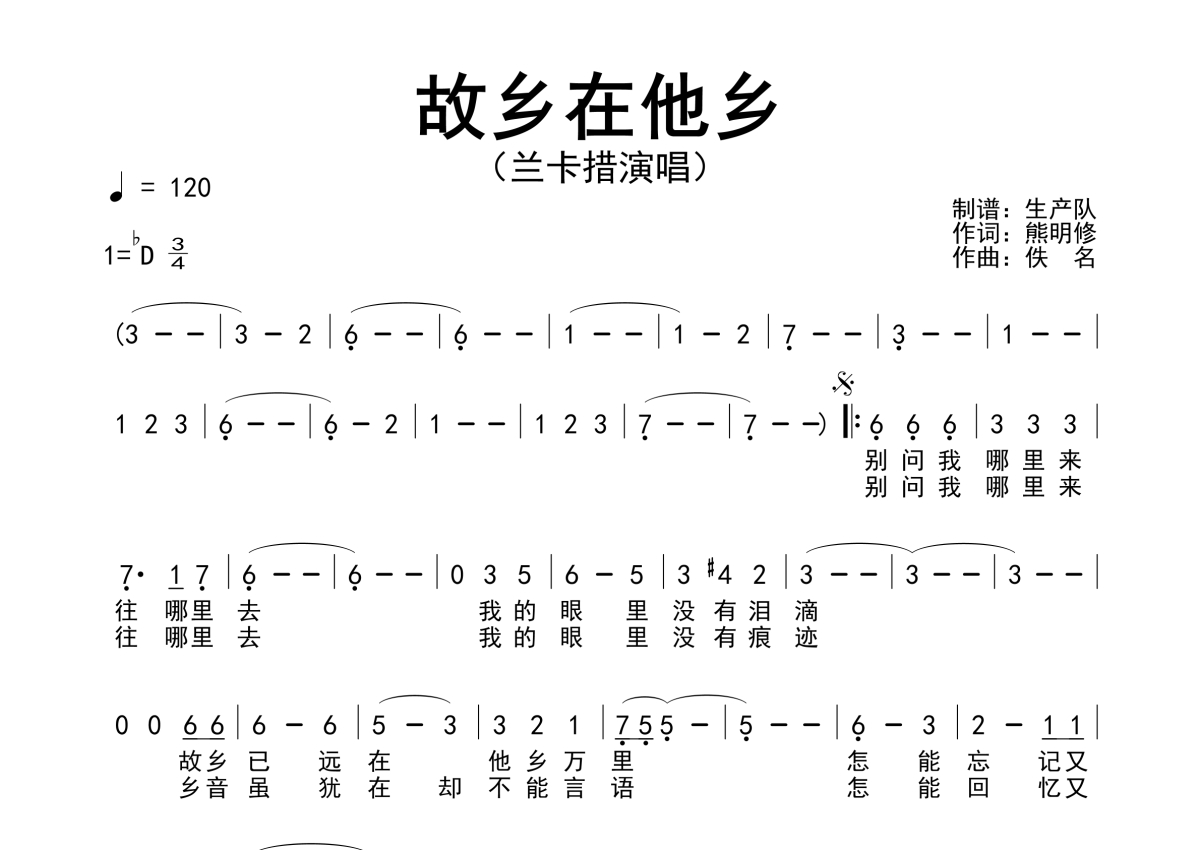 《故乡在他乡》是兰卡措演唱的一首歌曲,简谱,拍号为3/4拍,歌曲速度为每分钟120拍,这份简谱共有一张高清图谱,图谱由 @生产队 编配上传兰卡措演唱的歌曲《故乡在他乡》简谱。