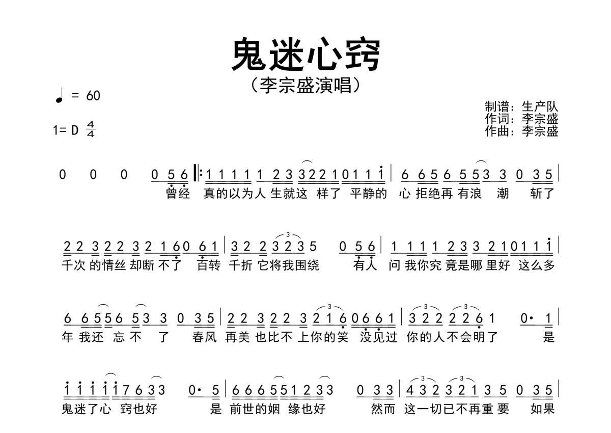 《鬼迷心窍》是李宗盛演唱的一首歌曲,简谱,拍号为4/4拍,歌曲速度为每分钟60拍,这份简谱共有一张高清图谱,图谱由 @生产队 编配上传李宗盛演唱的歌曲《鬼迷心窍》简谱。
