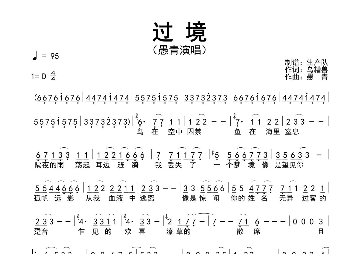《过境》是愚青演唱的一首歌曲,简谱,拍号为4/4拍,歌曲速度为每分钟95拍,这份简谱共有一张高清图谱,图谱由 @生产队 编配上传愚青演唱的歌曲《过境》简谱。