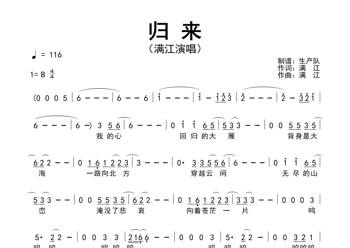 《归来》是满江演唱的一首歌曲,拍号为4/4拍,歌曲速度为每分钟116拍,这份简谱共有两张高清图谱,图谱由 @生产队 编配上传满江演唱的歌曲《归来》简谱。