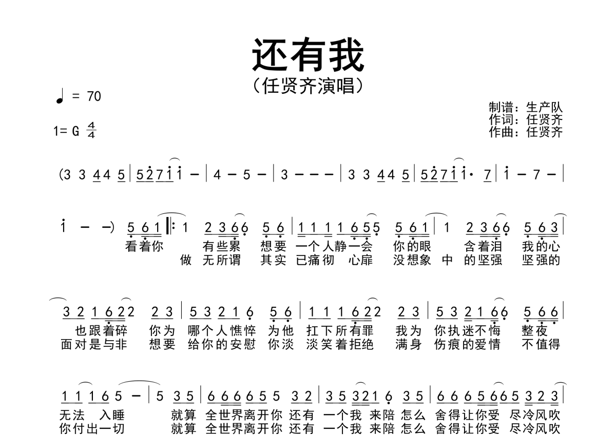 《还有我》是任贤齐演唱的一首歌曲,简谱,拍号为4/4拍,歌曲速度为每分钟70拍,这份简谱共有一张高清图谱,图谱由 @生产队 编配上传任贤齐演唱的歌曲《还有我》简谱。