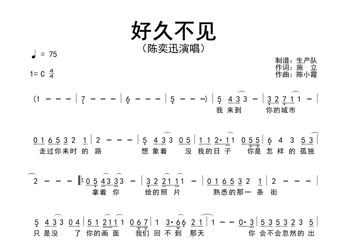 《好久不见》是陈奕迅演唱的一首歌曲,简谱,拍号为4/4拍,歌曲速度为每分钟75拍,这份简谱共有一张高清图谱,图谱由 @生产队 编配上传陈奕迅演唱的歌曲《好久不见》简谱。