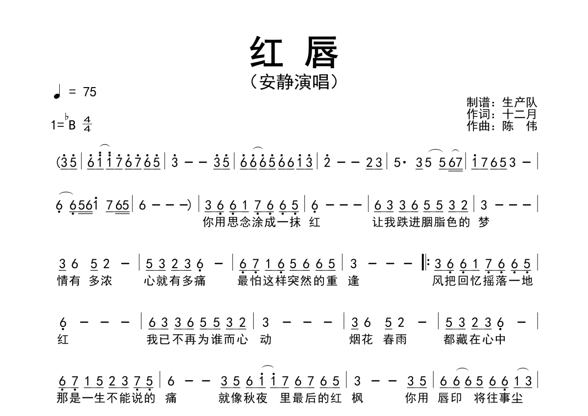 《红唇》是安静演唱的一首歌曲,简谱,拍号为4/4拍,歌曲速度为每分钟75拍,这份简谱共有一张高清图谱,图谱由 @生产队 编配上传安静演唱的歌曲《红唇》简谱。