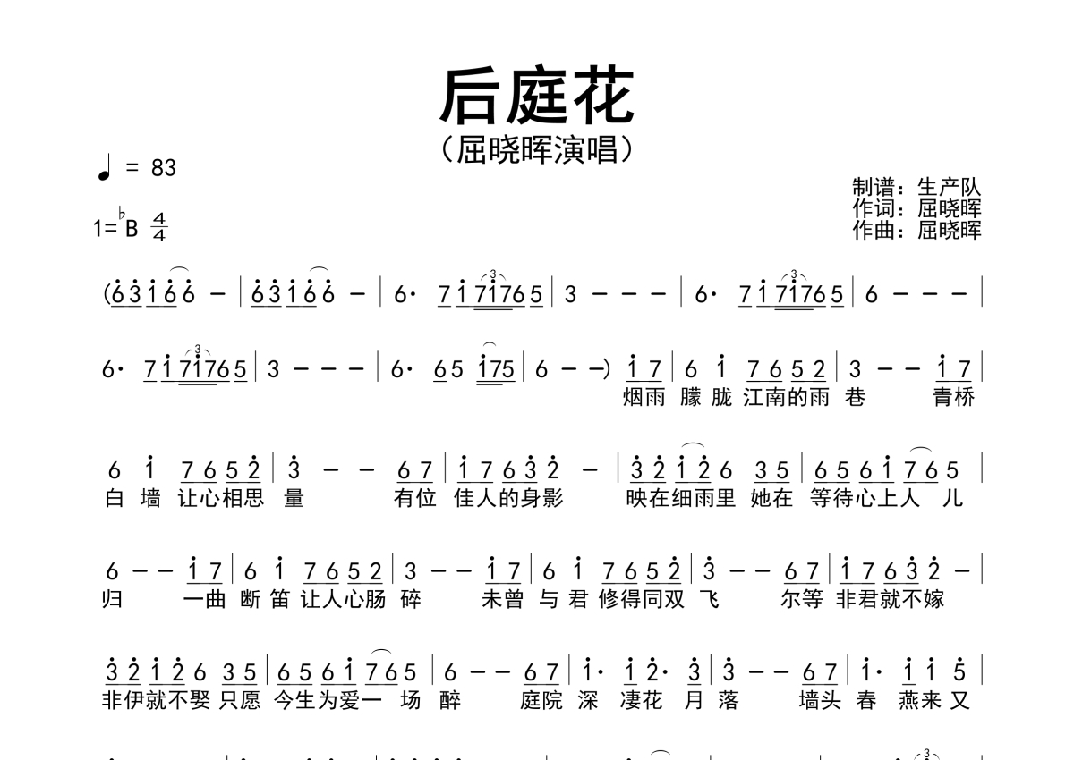 《后庭花》是屈晓晖演唱的一首歌曲,简谱,拍号为4/4拍,歌曲速度为每分钟83拍,这份简谱共有一张高清图谱,图谱由 @生产队 编配上传屈晓晖演唱的歌曲《后庭花》简谱。